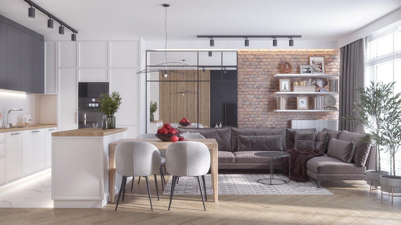 Przestronny, nowoczesny salon z aneksem kuchennym, w którym dominuje neutralna kolorystyka z akcentami drewna i cegły. Całość tworzy harmonijne połączenie współczesnego designu z elementami industrialnymi.